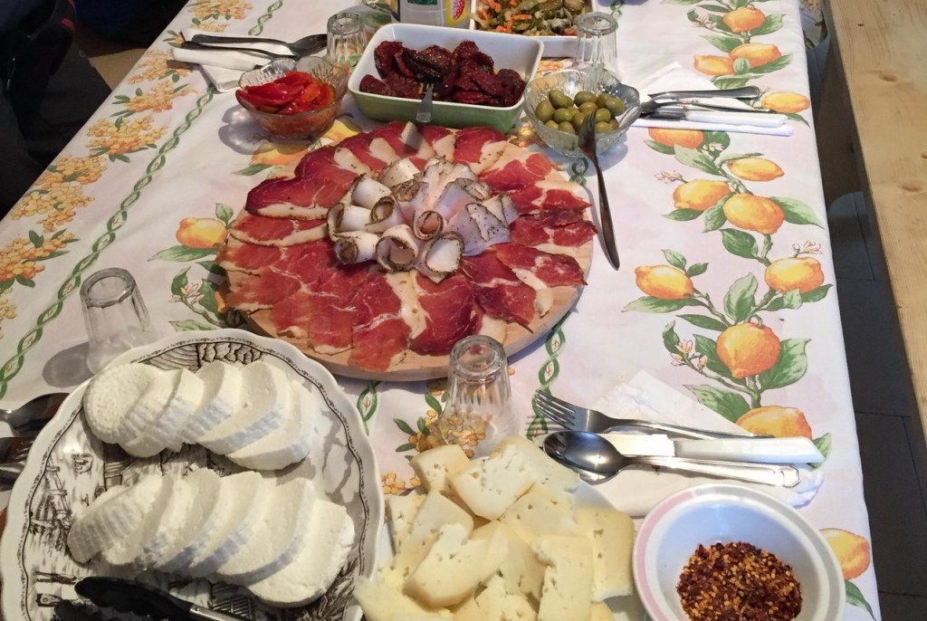 Antipasti: salumi locali di suino nero di Calabria, formaggio misto capra/pecora, fagioli e funghi, lestopitte, frittelle, ricotta fresca, pomodori secchi sott’olio, verdure grigliate.